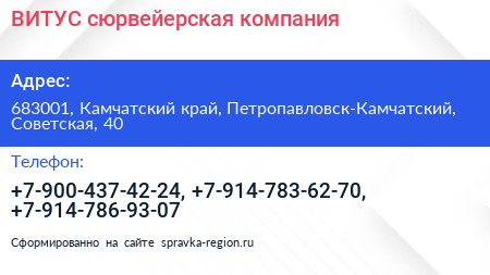 ВИТУС, сюрвейерская компания по адресу 683001, Камчатский край, Петропавловск-Камчатский, Советская, 40 в дальнейшем Организация, размещена в следующих категориях: