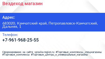 Вездеход, магазин по адресу 683020, Камчатский край, Петропавловск-Камчатский, Дальняя, 1 в дальнейшем Организация, размещена в следующих категориях: