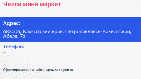 Челси, мини-маркет по адресу 683006, Камчатский край, Петропавловск-Камчатский, Абеля, 7а в дальнейшем Организация, размещена в следующих категориях: