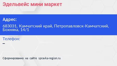 Эдельвейс, мини-маркет по адресу 683031, Камчатский край, Петропавловск-Камчатский, Бохняка, 14/1 в дальнейшем Организация, размещена в следующих категориях: