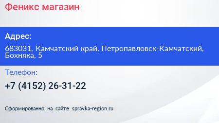 Феникс, магазин по адресу 683031, Камчатский край, Петропавловск-Камчатский, Бохняка, 5 в дальнейшем Организация, размещена в следующих категориях: