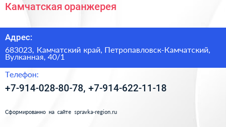 Камчатская оранжерея по адресу 683023, Камчатский край, Петропавловск-Камчатский, Вулканная, 40/1 в дальнейшем Организация, размещена в следующих категориях:
