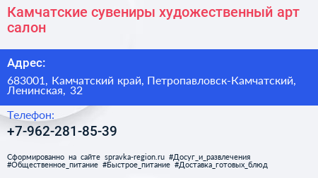 Камчатские сувениры, художественный арт-салон по адресу 683001, Камчатский край, Петропавловск-Камчатский, Ленинская, 32 в дальнейшем Организация, размещена в следующих категориях: