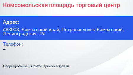 Комсомольская площадь, торговый центр по адресу 683003, Камчатский край, Петропавловск-Камчатский, Ленинградская, 49 в дальнейшем Организация, размещена в следующих категориях: