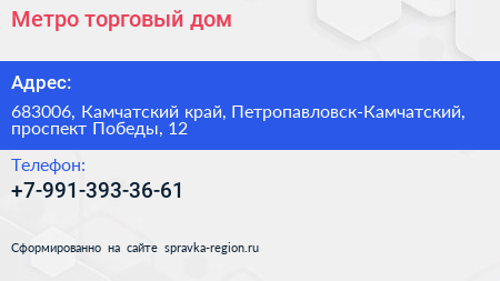 Метро, торговый дом по адресу 683006, Камчатский край, Петропавловск-Камчатский, проспект Победы, 12 в дальнейшем Организация, размещена в следующих категориях: