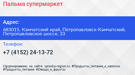 Пальма, супермаркет по адресу 683015, Камчатский край, Петропавловск-Камчатский, Петропавловское шоссе, 33 в дальнейшем Организация, размещена в следующих категориях: