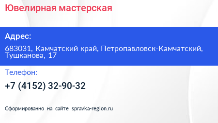 Ювелирная мастерская по адресу 683031, Камчатский край, Петропавловск-Камчатский, Тушканова, 17 в дальнейшем Организация, размещена в следующих категориях: