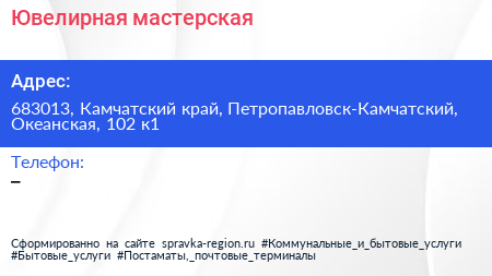 Ювелирная мастерская по адресу 683013, Камчатский край, Петропавловск-Камчатский, Океанская, 102 к1 в дальнейшем Организация, размещена в следующих категориях: