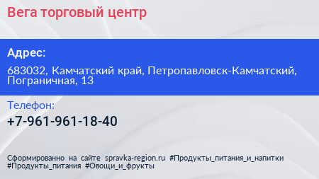Вега, торговый центр по адресу 683032, Камчатский край, Петропавловск-Камчатский, Пограничная, 13 в дальнейшем Организация, размещена в следующих категориях: