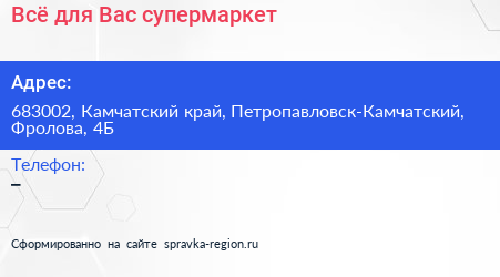 Всё для Вас, супермаркет по адресу 683002, Камчатский край, Петропавловск-Камчатский, Фролова, 4Б в дальнейшем Организация, размещена в следующих категориях: