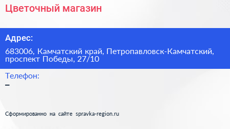 Цветочный магазин по адресу 683006, Камчатский край, Петропавловск-Камчатский, проспект Победы, 27/10 в дальнейшем Организация, размещена в следующих категориях: