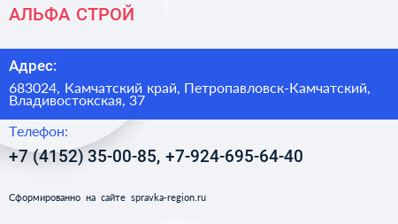 АЛЬФА-СТРОЙ по адресу 683024, Камчатский край, Петропавловск-Камчатский, Владивостокская, 37 в дальнейшем Организация, размещена в следующих категориях: