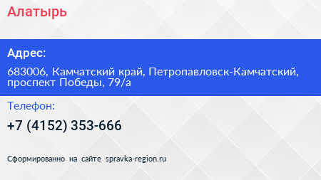 Алатырь по адресу 683006, Камчатский край, Петропавловск-Камчатский, проспект Победы, 79/а в дальнейшем Организация, размещена в следующих категориях: