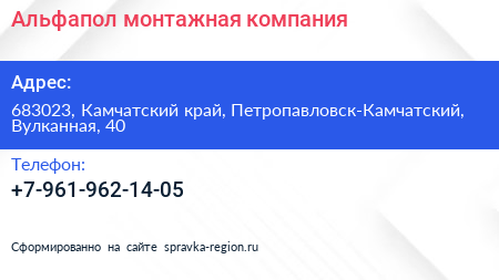 Альфапол, монтажная компания по адресу 683023, Камчатский край, Петропавловск-Камчатский, Вулканная, 40 в дальнейшем Организация, размещена в следующих категориях: