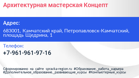 Архитектурная мастерская Концепт по адресу 683001, Камчатский край, Петропавловск-Камчатский, площадь Щедрина, 1 в дальнейшем Организация, размещена в следующих категориях: