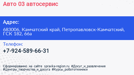 Авто-03, автосервис по адресу 683006, Камчатский край, Петропавловск-Камчатский, ГСК 182, 66а в дальнейшем Организация, размещена в следующих категориях: