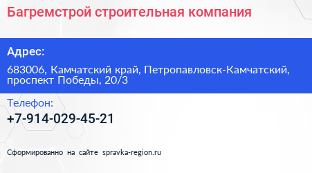 Багремстрой, строительная компания по адресу 683006, Камчатский край, Петропавловск-Камчатский, проспект Победы, 20/3 в дальнейшем Организация, размещена в следующих категориях: