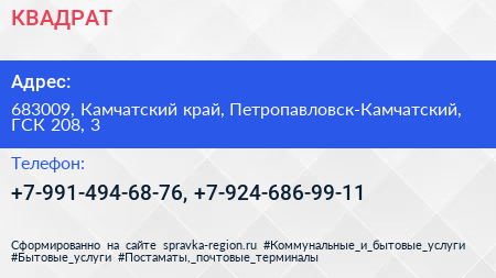 КВАДРАТ по адресу 683009, Камчатский край, Петропавловск-Камчатский, ГСК 208, 3 в дальнейшем Организация, размещена в следующих категориях: