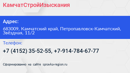 КамчатСтройИзыскания по адресу 683009, Камчатский край, Петропавловск-Камчатский, Звёздная, 11/2 в дальнейшем Организация, размещена в следующих категориях: