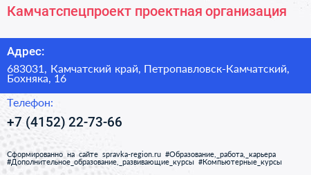 Камчатспецпроект, проектная организация по адресу 683031, Камчатский край, Петропавловск-Камчатский, Бохняка, 16 в дальнейшем Организация, размещена в следующих категориях: