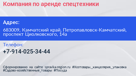 Компания по аренде спецтехники по адресу 683009, Камчатский край, Петропавловск-Камчатский, проспект Циолковского, 14а в дальнейшем Организация, размещена в следующих категориях: