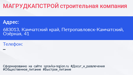 МАГРУДКАПСТРОЙ, строительная компания по адресу 683013, Камчатский край, Петропавловск-Камчатский, Озёрная, 41 в дальнейшем Организация, размещена в следующих категориях: