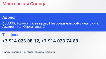 Мастерская Солнца по адресу 683009, Камчатский край, Петропавловск-Камчатский, Академика Курчатова, 3 в дальнейшем Организация, размещена в следующих категориях: