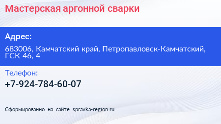Мастерская аргонной сварки по адресу 683006, Камчатский край, Петропавловск-Камчатский, ГСК 46, 4 в дальнейшем Организация, размещена в следующих категориях: