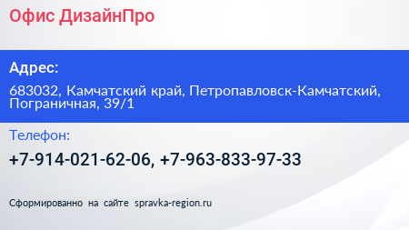 Офис ДизайнПро по адресу 683032, Камчатский край, Петропавловск-Камчатский, Пограничная, 39/1 в дальнейшем Организация, размещена в следующих категориях: