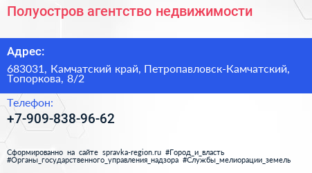 Полуостров, агентство недвижимости по адресу 683031, Камчатский край, Петропавловск-Камчатский, Топоркова, 8/2 в дальнейшем Организация, размещена в следующих категориях: