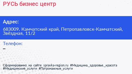 РУСЬ, бизнес-центр по адресу 683009, Камчатский край, Петропавловск-Камчатский, Звёздная, 11/2 в дальнейшем Организация, размещена в следующих категориях: