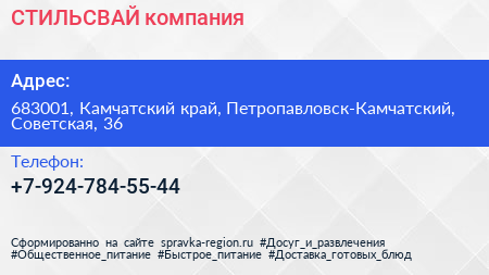 СТИЛЬСВАЙ, компания по адресу 683001, Камчатский край, Петропавловск-Камчатский, Советская, 36 в дальнейшем Организация, размещена в следующих категориях: