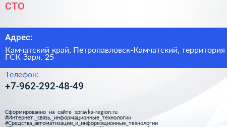 СТО по адресу Камчатский край, Петропавловск-Камчатский, территория ГСК Заря, 25 в дальнейшем Организация, размещена в следующих категориях: