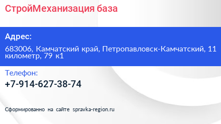 СтройМеханизация, база по адресу 683006, Камчатский край, Петропавловск-Камчатский, 11 километр, 79 к1 в дальнейшем Организация, размещена в следующих категориях: