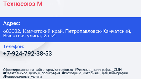 Техносоюз-М по адресу 683032, Камчатский край, Петропавловск-Камчатский, Высотная улица, 2а к4 в дальнейшем Организация, размещена в следующих категориях: