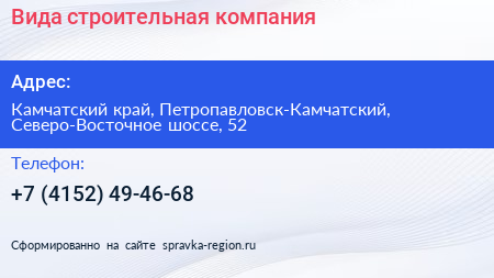 Вида, строительная компания по адресу Камчатский край, Петропавловск-Камчатский, Северо-Восточное шоссе, 52 в дальнейшем Организация, размещена в следующих категориях: