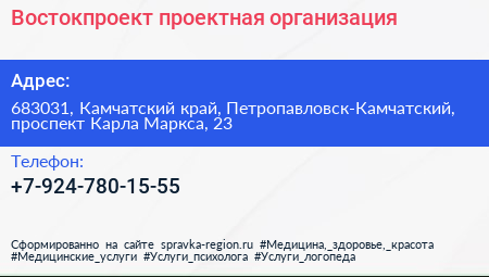 Востокпроект, проектная организация по адресу 683031, Камчатский край, Петропавловск-Камчатский, проспект Карла Маркса, 23 в дальнейшем Организация, размещена в следующих категориях: