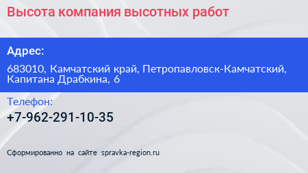 Высота, компания высотных работ по адресу 683010, Камчатский край, Петропавловск-Камчатский, Капитана Драбкина, 6 в дальнейшем Организация, размещена в следующих категориях:
