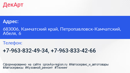 ДекАрт по адресу 683006, Камчатский край, Петропавловск-Камчатский, Абеля, 6 в дальнейшем Организация, размещена в следующих категориях: