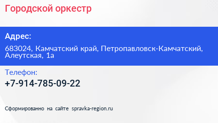 Городской оркестр по адресу 683024, Камчатский край, Петропавловск-Камчатский, Алеутская, 1а в дальнейшем Организация, размещена в следующих категориях: