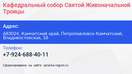 Кафедральный собор Святой Живоначальной Троицы по адресу 683024, Камчатский край, Петропавловск-Камчатский, Владивостокская, 18 в дальнейшем Организация, размещена в следующих категориях: