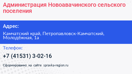 Администрация Новоавачинского сельского поселения по адресу Камчатский край, Петропавловск-Камчатский, Молодёжная, 1а в дальнейшем Организация, размещена в следующих категориях: