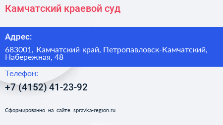 Камчатский краевой суд по адресу 683001, Камчатский край, Петропавловск-Камчатский, Набережная, 48 в дальнейшем Организация, размещена в следующих категориях: