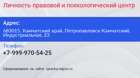 Личность, правовой и психологический центр по адресу 683015, Камчатский край, Петропавловск-Камчатский, Индустриальная, 23 в дальнейшем Организация, размещена в следующих категориях: