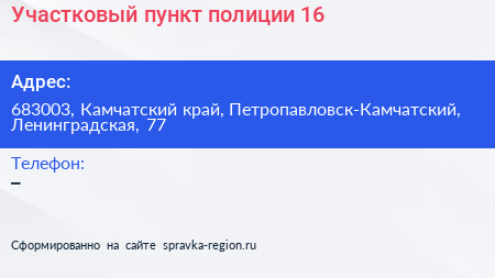 Участковый пункт полиции №16 по адресу 683003, Камчатский край, Петропавловск-Камчатский, Ленинградская, 77 в дальнейшем Организация, размещена в следующих категориях: