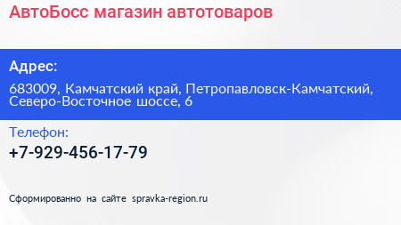 АвтоБосс, магазин автотоваров по адресу 683009, Камчатский край, Петропавловск-Камчатский, Северо-Восточное шоссе, 6 в дальнейшем Организация, размещена в следующих категориях: