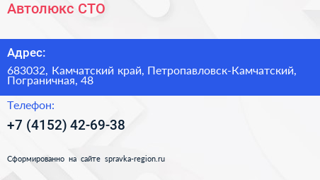 Автолюкс, СТО по адресу 683032, Камчатский край, Петропавловск-Камчатский, Пограничная, 48 в дальнейшем Организация, размещена в следующих категориях: