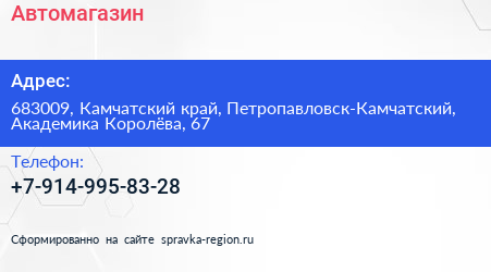 Автомагазин по адресу 683009, Камчатский край, Петропавловск-Камчатский, Академика Королёва, 67 в дальнейшем Организация, размещена в следующих категориях: