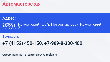 Автомастерская по адресу 683003, Камчатский край, Петропавловск-Камчатский, ГСК 38, 2 в дальнейшем Организация, размещена в следующих категориях: