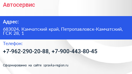 Автосервис по адресу 683024, Камчатский край, Петропавловск-Камчатский, ГСК 28, 1 в дальнейшем Организация, размещена в следующих категориях: